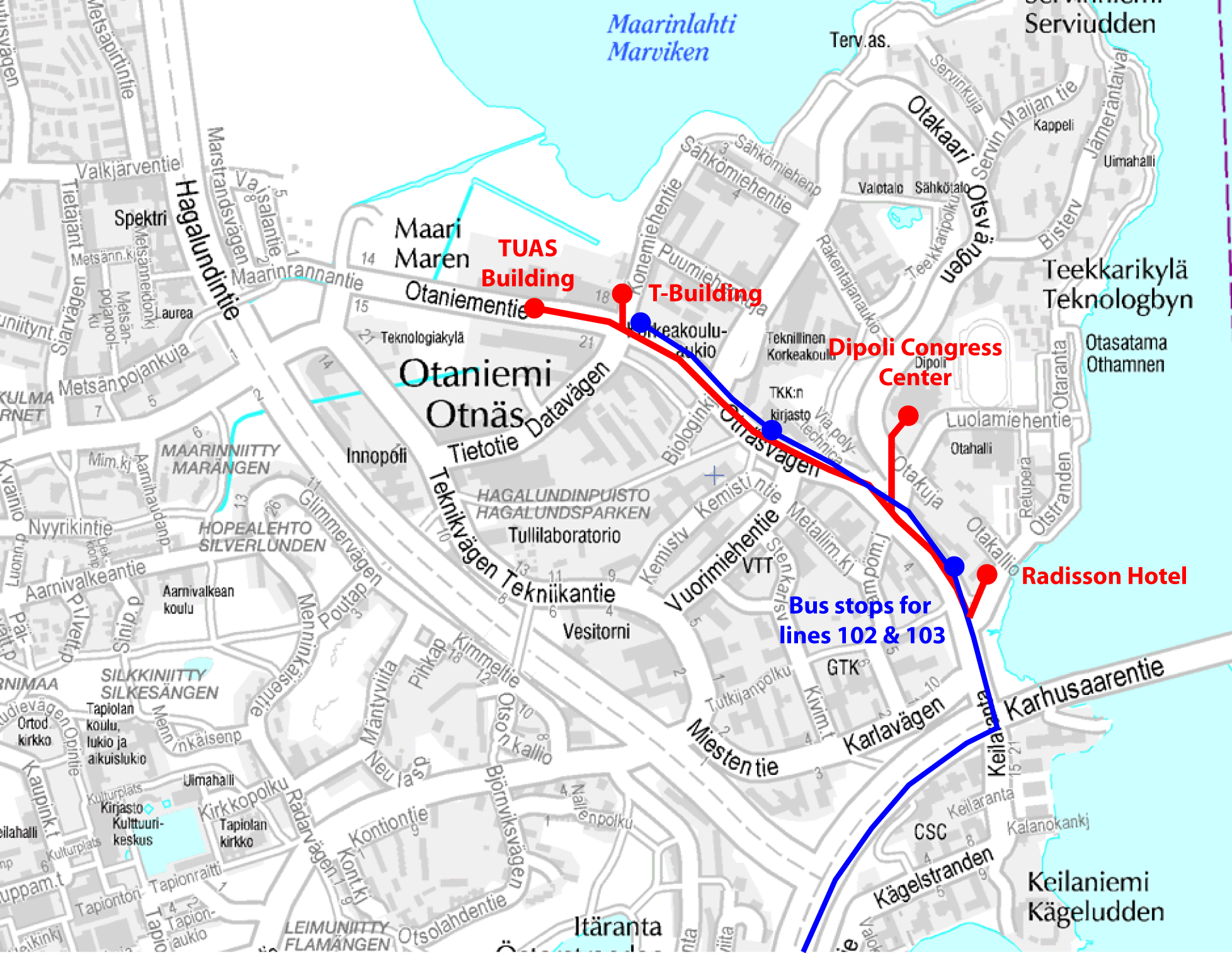 The bus 102, 102T and 103 leaving from the Kamppi bus terminal in Helsinki are a straight connection to the conference site (approximately 20 minutes).